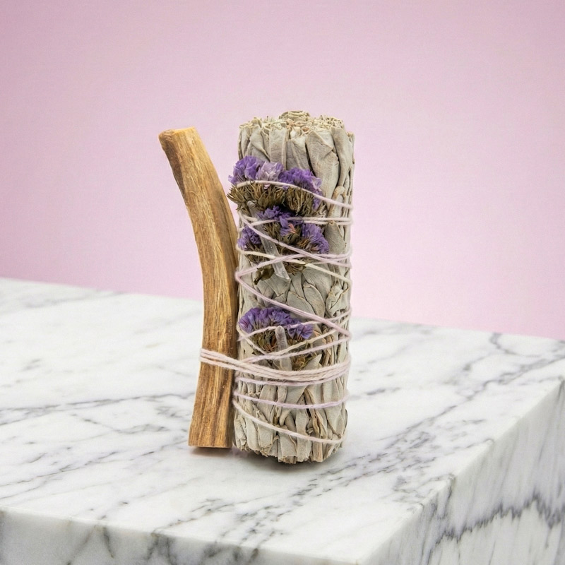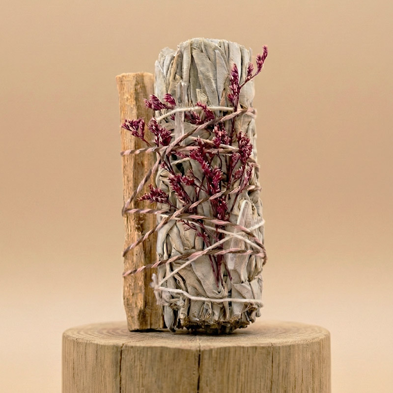 Agrémentés de fleurs séchées aux teintes vibrantes et d’une pointe de quartz, choisie pour ses vertus énergétiques, ces créations invitent à un véritable rituel de bien-être. Accompagné d’un bâton de palo santo, chaque ensemble devient un précieux allié pour vos moments de recentrage et de méditation.